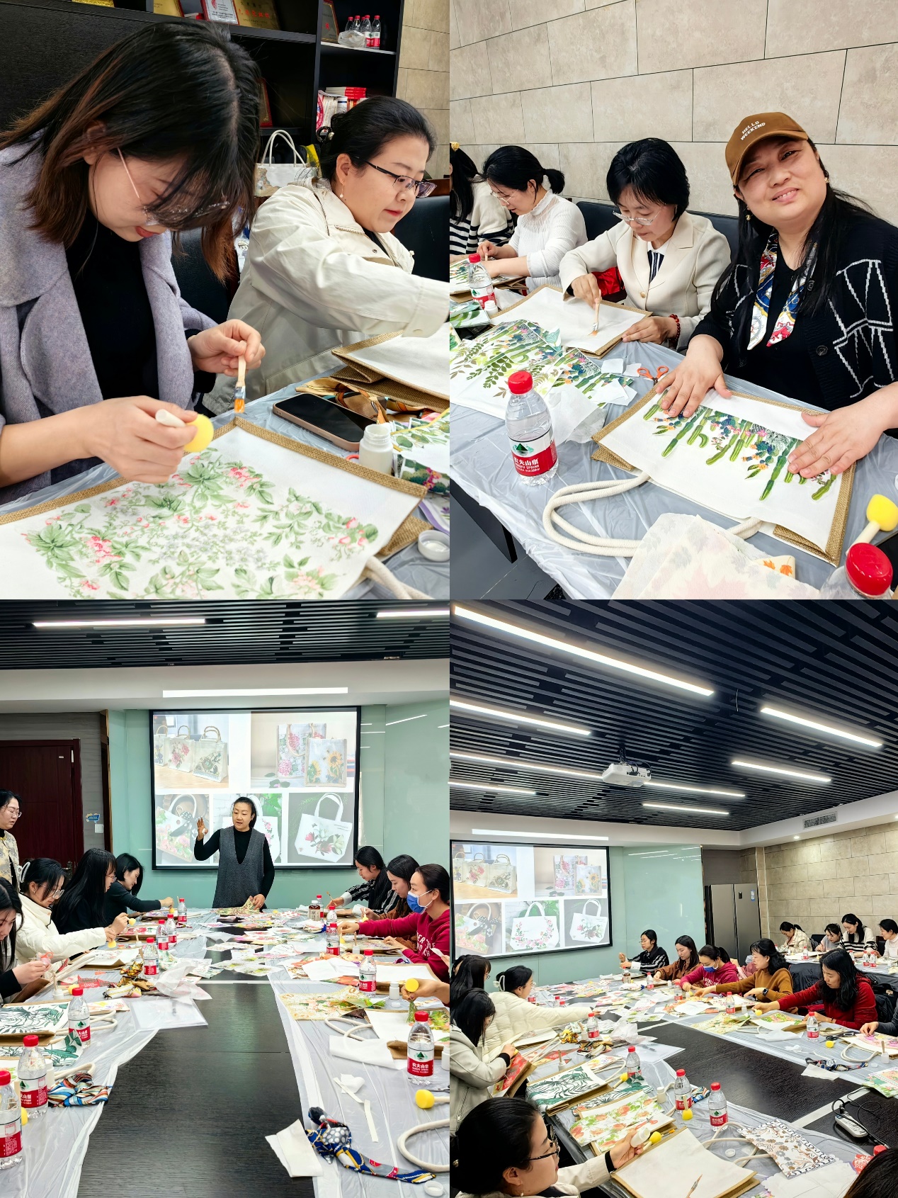 专业老师为女教师们详细介绍了18世纪欧洲“蝶骨巴特包”装饰艺术的历史渊源以及制作技巧和经验。女教师们被这项从贵族的书房走向现代生活的技艺深深吸引。
