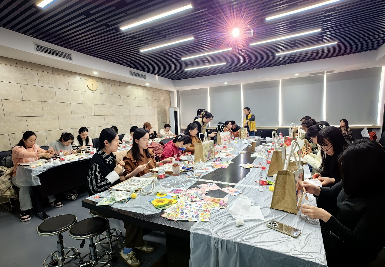 在手工环节中,会议室立刻变成了一个“把平凡变成魔法”的创意工坊。女教师们精心挑选了印有花卉、藤蔓等复古图案的纸品,她们细心地裁剪、排版设计,轻巧地使用刷胶笔,将零散的纸片转化成一件件艺术品,每一个细节都透露出巧思,闪烁着灵光。不同的图案风格在这一刻完美地融合,这不仅是时代的碰撞,更是思维的迸发。