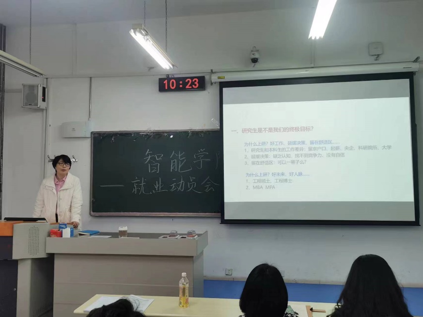 刘晓杰老师以“研究生是不是我们的终极目标,我们为什么要上研”的深刻发问引出会议主题,接着从研究生和本科生的工作差异、“二战考研”将面临的现实等几个方面进行了详细讲解,并与同学们交流“当下我们应该做什么?”刘晓杰老师希望智能学子建立自信,提前规划,鼓励同学们通过借助于应届生身份尽力找到理想的工作。
