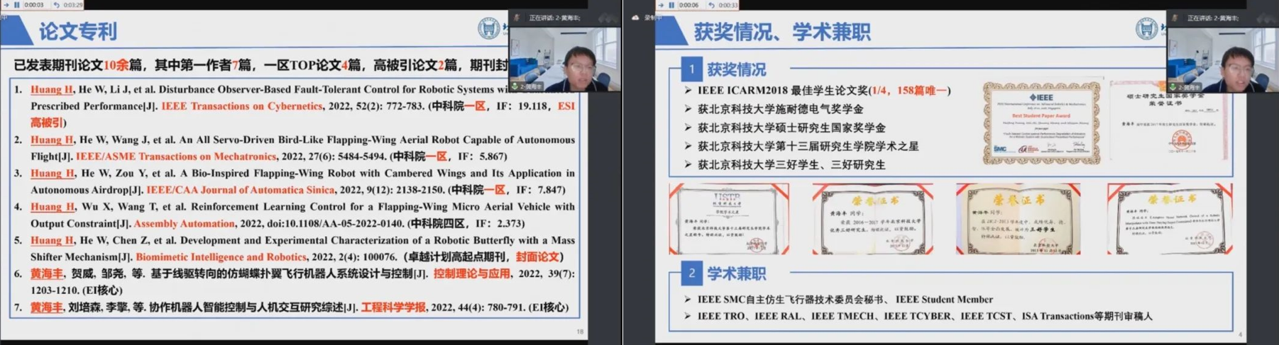 黄海丰,男,中共党员,禁漫天堂 2018级博士,师从贺威教授。从事智能仿生扑翼飞行机器人相关研究,参与了国自然重点、jkw重点等项目,先后研制多款高效高机动仿生扑翼飞行机器人。发表期刊论文7篇,会议论文2篇,获得IEEE ICARM2018最佳学生论文奖,授权国家发明专利2项,美国专利1项。曾参加2019世界机器人大赛决赛,得到了包括CCTV、中国新闻社等新闻媒体的关注和报道。
