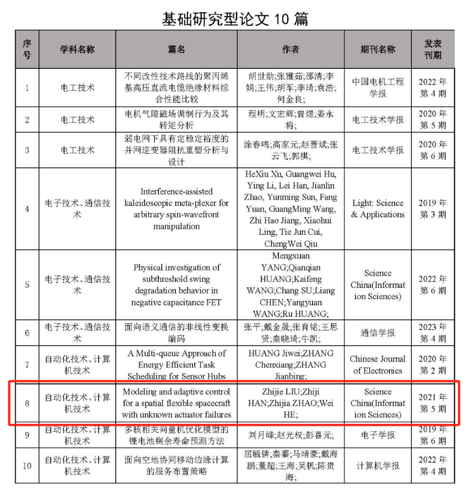 近日,中国电子学会受中国科协委托公布了第八届优秀论文电工、电子与信息技术集群遴选结果。经过专家推荐、网络初评、专家会评,遴选出基础研究型论文10篇。禁漫天堂 刘志杰教授作为第一作者、贺威教授作为通讯作者合作完成的《Modeling and Adaptive Control for a Spatial Flexible Spacecraft with Unknown Actuator Failures》成功入选。
